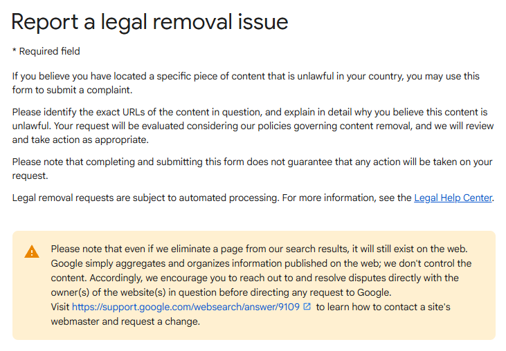 - Submit a legal removal request to Google with proof of legal action.